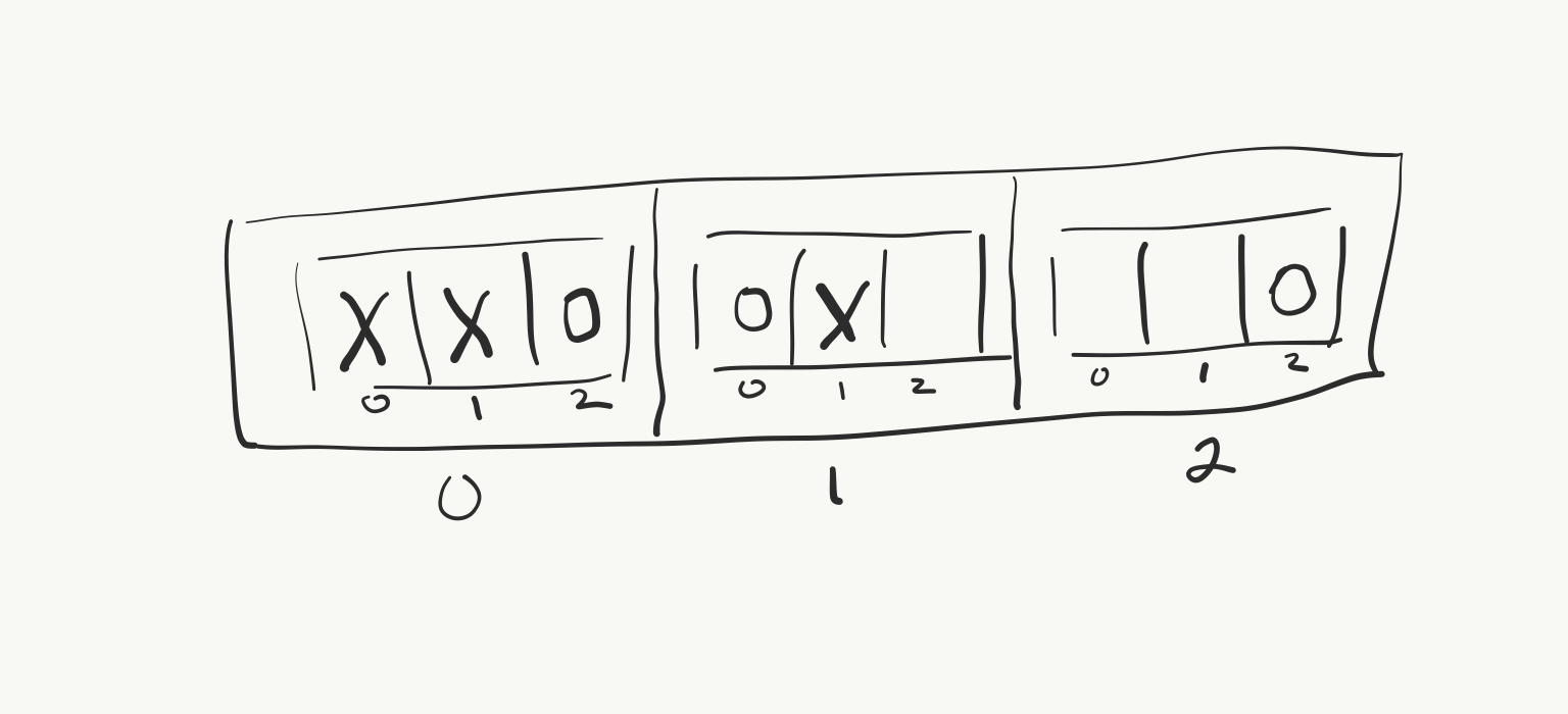 You, the programmer, are responsible for mapping your game's concepts of rows and columns to your data model's array of arrays. The figure above shows what a Tic Tac Toe board looks like as an array of arrays, but it's entirely up to you whether the inner arrays represent the rows or the columns. This is a choice you make at the beginning of coding your game, and then you just need to keep it straight in your head, and document your choice in your code.