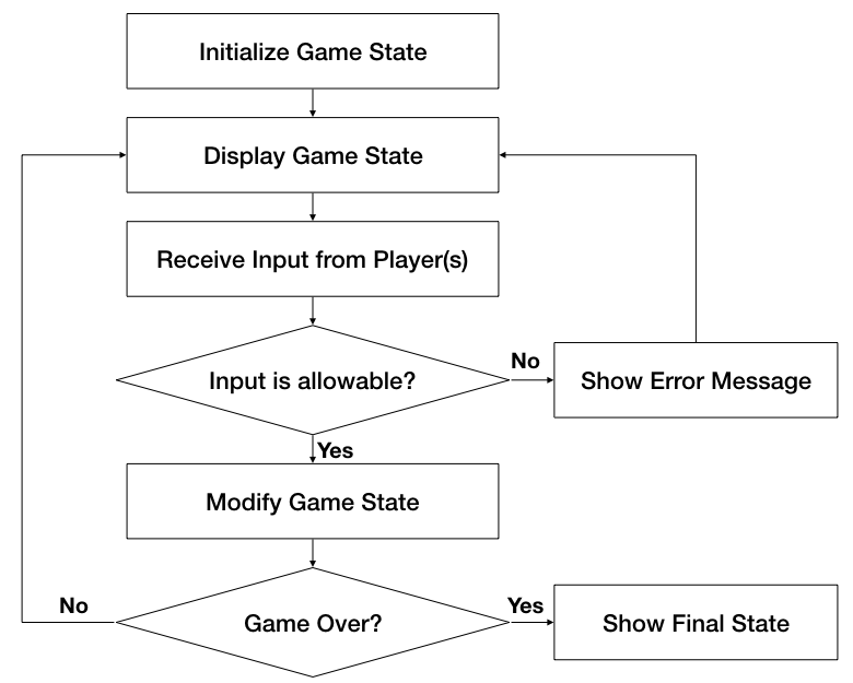 As we said in the Foreword, Elemental Java uses games as a motivating application to learn computer programming. What we consider a game ranges from board games and card games to first-person shooters. We also include puzzles in what we consider a game. Almost all games can be abstractly represented in the simple model below.